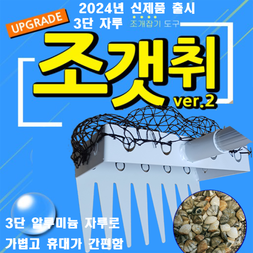 한동안(3년 정도) 모래 전용 조개잡이 도구 조갯취를 생산 및 판매를 않아 많은 사람이 판매 관련 문의전화가 많았습니다. 성원에 힘입어 2024년 조갯취를 새롭게 디자인 및 설계를 하여 출시하게 되었습니다. 조갯취 헤드의 크기를 늘리고 내구성을 향상시켰으며 그물 조립 방식을 변경하여 수리가 용이합니다. 또한 3단 알루미늄 자루로 휴대가 편리하도록 제작하였습니다. 조갯취로 가족 또는 연인과 함께 쉽게 조개를 잡으며 추억을 만들어 보세요. 자세한 내용은 아래 링크를 참조하여 주세요. https://bit.ly/3UCcpvh 광고성 글입니다. 원치 않으면 삭제하셔도 괜찮습니다. 비번 : 0000